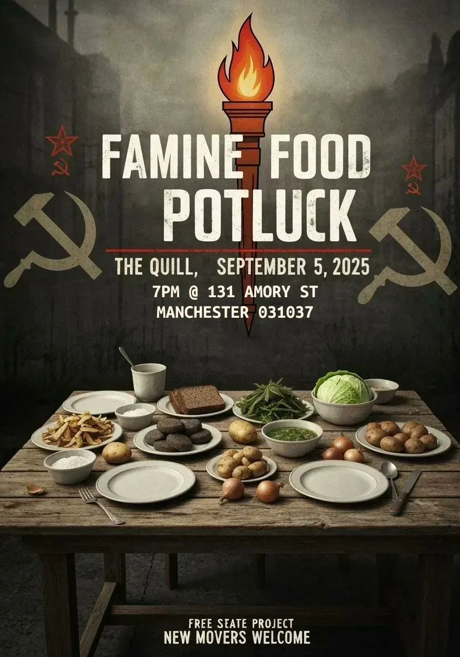 How long until the communists come for our monthly Manchester potluck dinners? (In fact, that potluck is tonight and you are invited.)