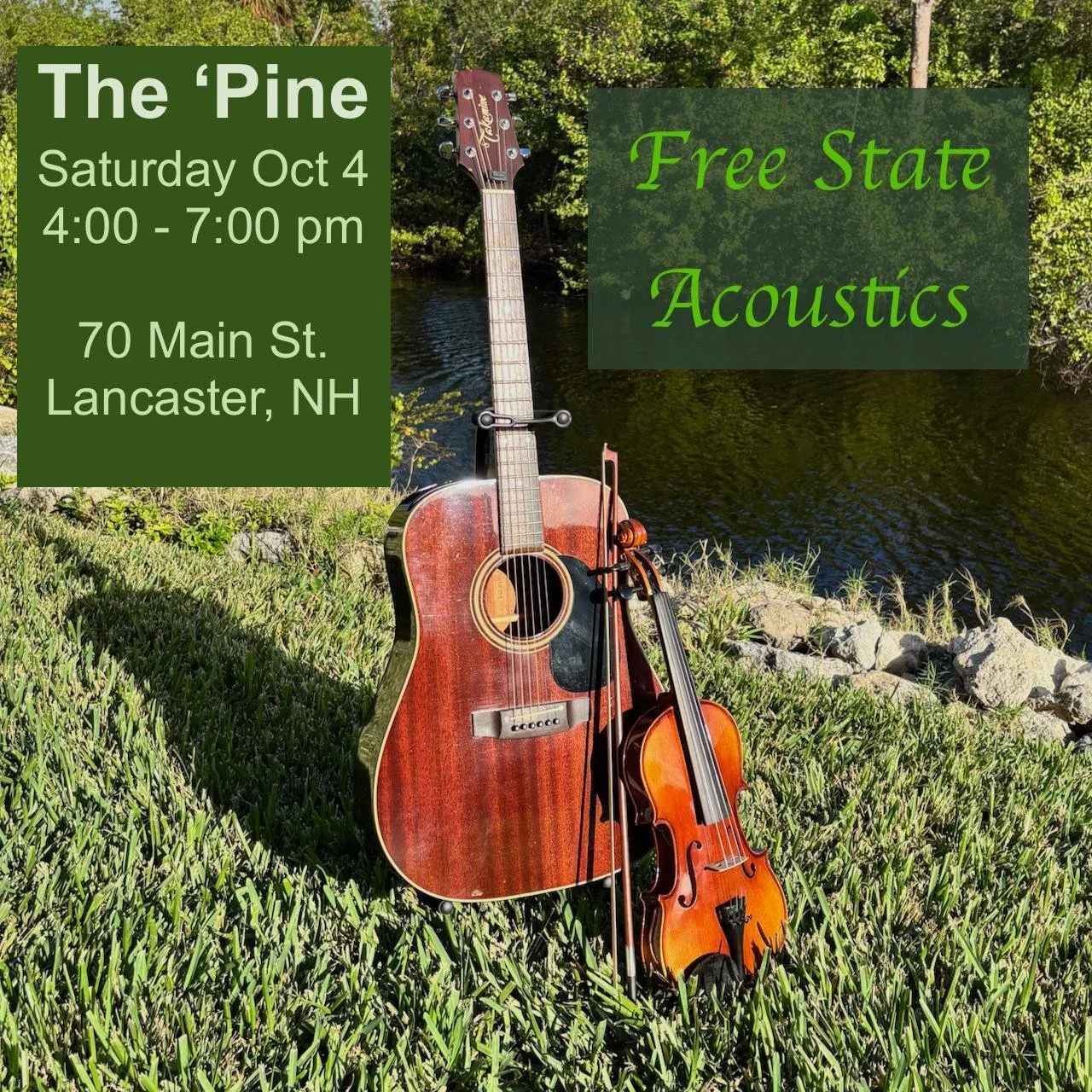 Lancaster, 4pm-7 - Free State Acoustics Performance - Gather at The 'Pine for a full three-set show closing out the summer season with the peak leaf colors. Free State Acoustics is a four piece band playing a wide variety of interesting songs from the 1950s through today in their own acoustic-focused style developed out of PorcFest fireside jams and public performances for music lovers. Free for The 'Pine members ($5 donation for non-members). Hosted by Amy Norris. (the 'Pine Clubhouse - 70 Main St, 2nd floor, Lancaster)