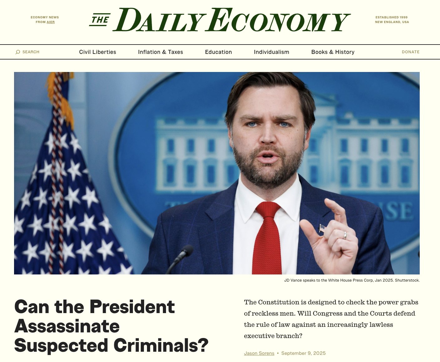 Jason Sorens (FSP Founder) takes aim at the Trump Administration for claiming power to execute extra-judicial killings without authorization from Congress.
