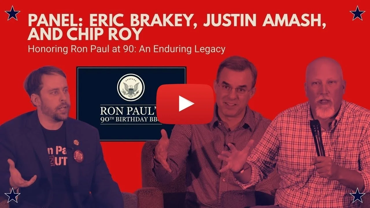"Honoring Ron Paul at 90: An Enduring Legacy." This panel brings together Eric Brakey, Justin Amash, and Chip Roy to celebrate Ron Paul’s 90th birthday and reflect on carrying the torch of liberty in politics.